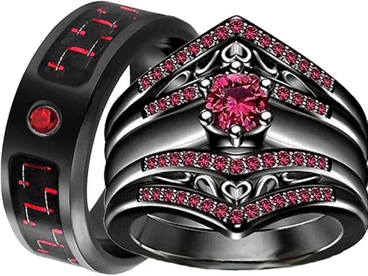 Engagement Ring Wedding Trio Set for His and Her Black Gold Plated